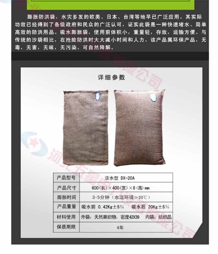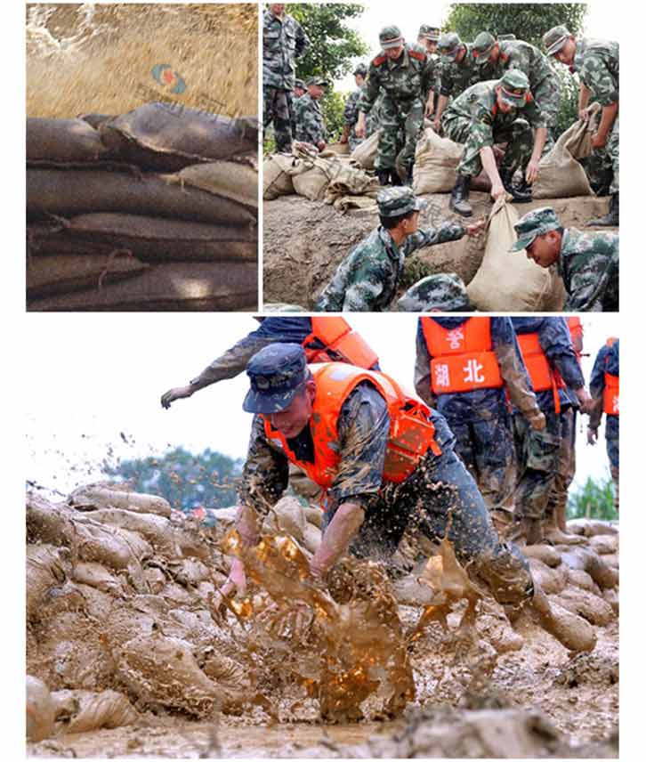 吸水膨脹袋內(nèi)裝的是新型的高分子納米吸水物質(zhì),這種物質(zhì)無毒、無味、無污染,吸水膨脹前為極小的顆粒物質(zhì),吸水后為黑豆大小的含水物質(zhì),干凈且無公害,待高分子吸水物質(zhì)使用后可用于農(nóng)業(yè)保水抗旱,所以在洪水過后可就地將袋內(nèi)的物質(zhì)傾倒入農(nóng)田中,在泥土中可完全分解,是綠色環(huán)保、一舉兩得的首選產(chǎn)品。外袋為純麻布和棉布織成,遇水后麻繩可更加結(jié)實(shí)耐磨。